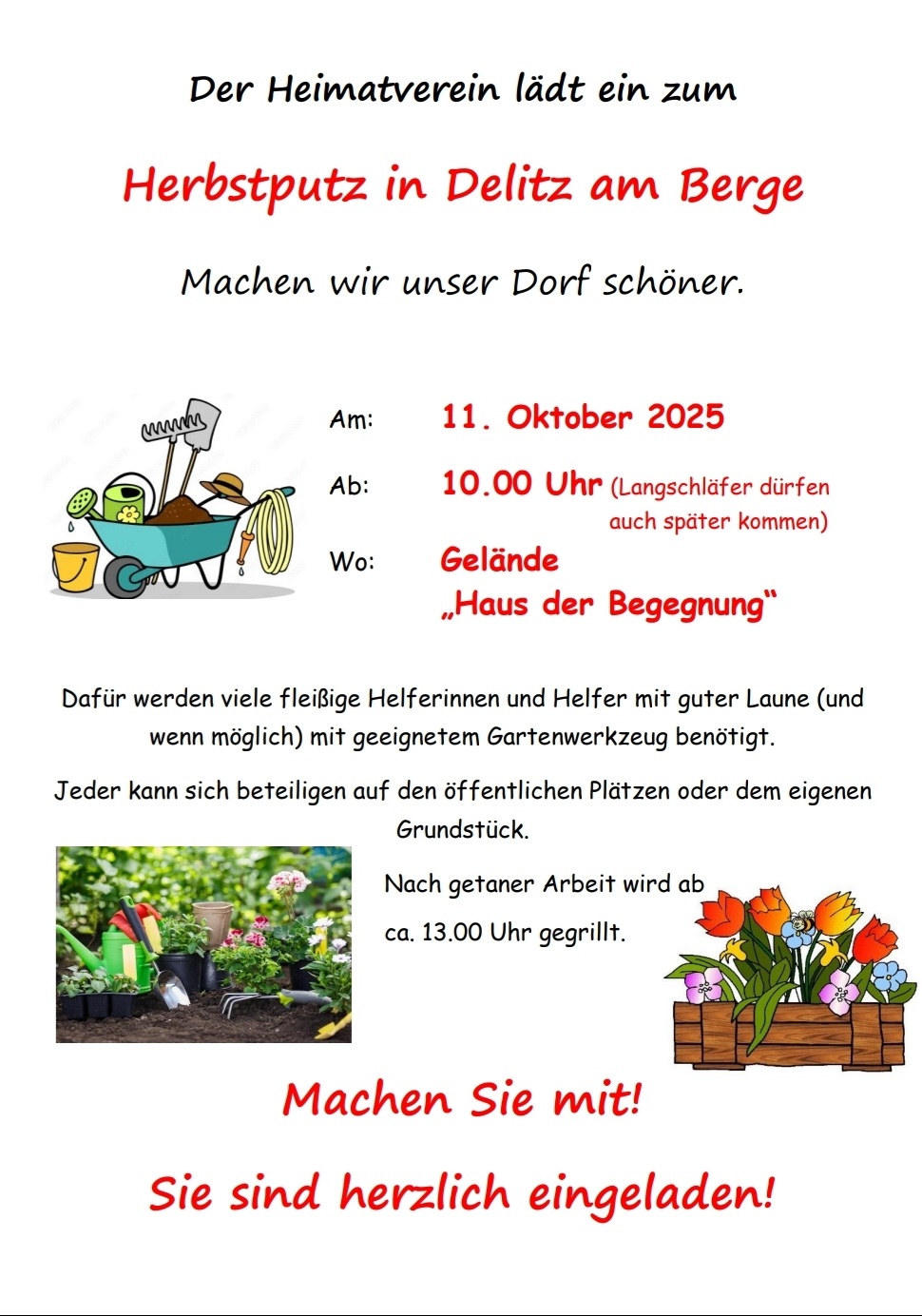 Einladung zum Herbstputz Geschrieben am 27. September 202527. September 2025 von Peggy Rähme Machen wir unser Dorf schöner!